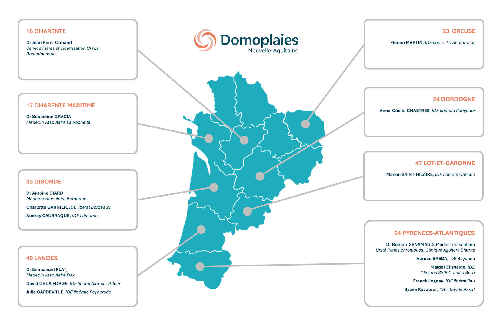 Domoplaies Nouvelle-Aquitaine regroupe actuellement sur 16 professionnels de santé — médecins et infirmiers experts en plaies et cicatrisation de 8 départements — qui interviennent en téléconsultation assistée à domicile et/ou téléexpertise.